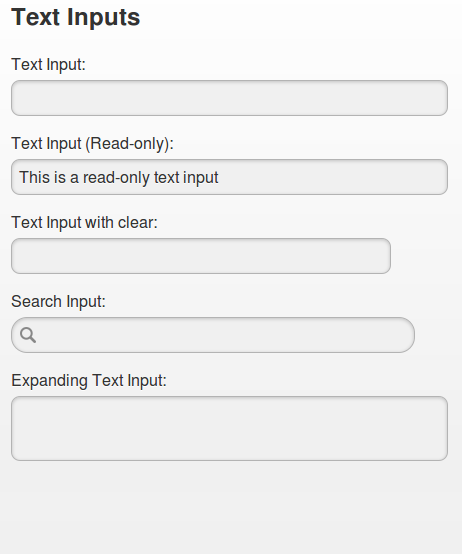 <body> <div data-role="page"> <div data-role="header" class="ui-bar-a ui-header" role="banner"> <a id="backButton" href="/index.html" data-icon="arrow-l" data-theme="a">Back</a> <h1 class="ui-title" tabindex="0" role="heading" aria-level="1">Form Elements</h1> </div> <div data-role="content" class="ui-body-c"> <form action="form.php" method="post"> <h2>Text Inputs</h2> <!-- Standard text input --> <div data-role="fieldcontain"> <label for="name">Text Input:</label> <input type="text" name="name" id="name" value="" /> </div> <!-- Standard text input (read-only mode) --> <div data-role="fieldcontain"> <label for="name">Text Input (Read-only):</label> <input type="text" name="name" id="name" value="This is a read-only text input" readonly="readonly" /> </div> <!-- Text Input with clear button --> <div data-role="fieldcontain" class="ui-field-contain-clear-input"> <label for="name">Text Input with clear:</label> <input type="search" name="search" id="search" value="" /> </div> <!-- Search Text Input with Clear Button --> <div data-role="fieldcontain"> <label for="search">Search Input:</label> <input type="search" name="search" id="search" value="" /> </div> <!-- Expanding Text Input. You can add a maxrows parameter to define the maximum number of lines which it extends --> <div data-role="fieldcontain"> <label for="textarea">Expanding Text Input:</label> <textarea cols="40" rows="2" name="textarea" id="textarea"></textarea> </div> </form> </div> </div> </body>