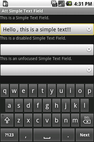 <?xml version="1.0" encoding="utf-8"?> <RelativeLayout xmlns:android="http://schemas.android.com/apk/res/android" android:layout_width="wrap_content" android:layout_height="wrap_content" > <TextView android:id="@+id/textFieldAndroid" android:layout_width="fill_parent" android:layout_height="wrap_content" android:text="This is a Simple Text Field." android:paddingBottom="10dp"/> <com.att.widgets.lib.edittext.SimpleTextField android:id="@+id/simpleTextField" android:layout_width="wrap_content" android:layout_height="wrap_content" android:layout_below="@id/textFieldAndroid"/> <TextView android:id="@+id/textFieldAndroid_2" android:layout_width="fill_parent" android:layout_height="wrap_content" android:layout_below="@id/simpleTextField" android:text="This is a disabled Simple Text Field." android:paddingBottom="10dp"/> <com.att.widgets.lib.edittext.SimpleTextField android:id="@+id/simpleTextField_2" android:layout_width="wrap_content" android:layout_height="wrap_content" android:layout_below="@id/textFieldAndroid_2"/> <TextView android:id="@+id/textFieldAndroid_3" android:layout_width="fill_parent" android:layout_height="wrap_content" android:layout_below="@id/simpleTextField_2" android:text="This is an unfocusable Simple Text Field." android:paddingBottom="10dp"/> <com.att.widgets.lib.edittext.SimpleTextField android:id="@+id/simpleTextField_3" android:layout_width="wrap_content" android:layout_height="wrap_content" android:layout_below="@id/textFieldAndroid_3"/> </RelativeLayout>
